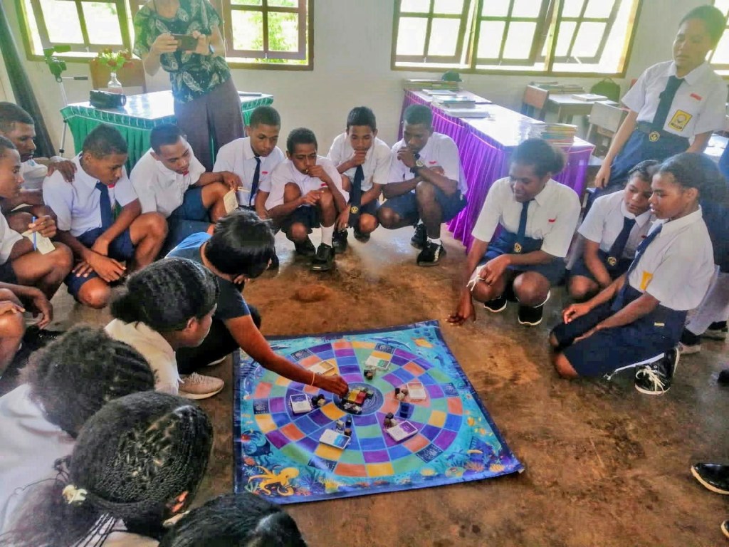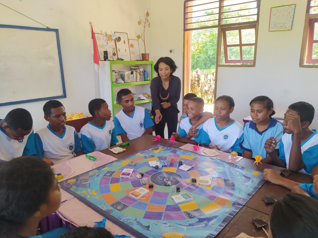 As the MIR crew set sail on the Coral Triangle Voyages, they brought with them a great tool for environmental education: ecogames’ flagship game Operation Ocean. This giant game quickly became a sensation in schools in Raja Ampat, serving as an immersive learning experience that took students on an underwater adventure, allowing them to explore and learn more about the ocean’s delicate ecosystems and the importance of conservation.
