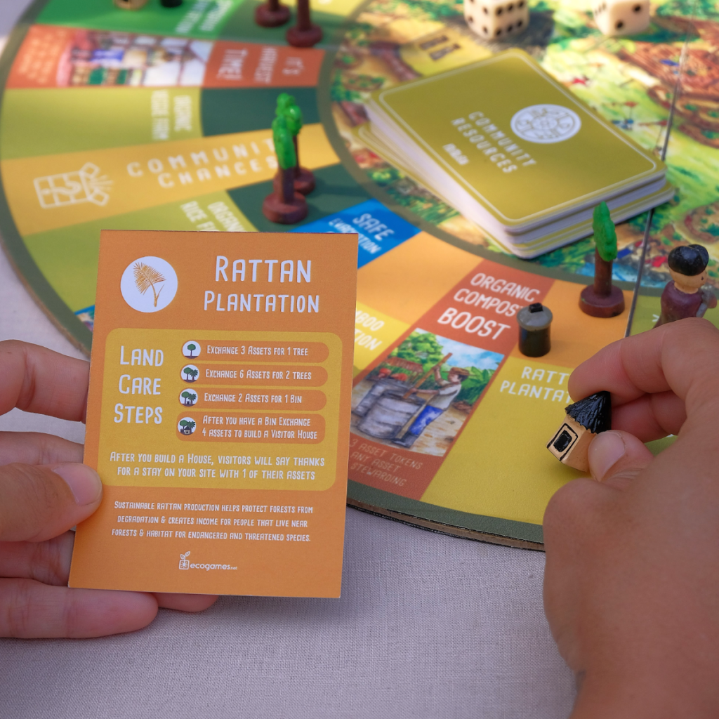 The game comes complete with a game board, community resource cards, chance cards, dice, tokens, trees, and carbon offset certificates. Each component plays a vital role in the game’s immersive and educational gameplay experience.