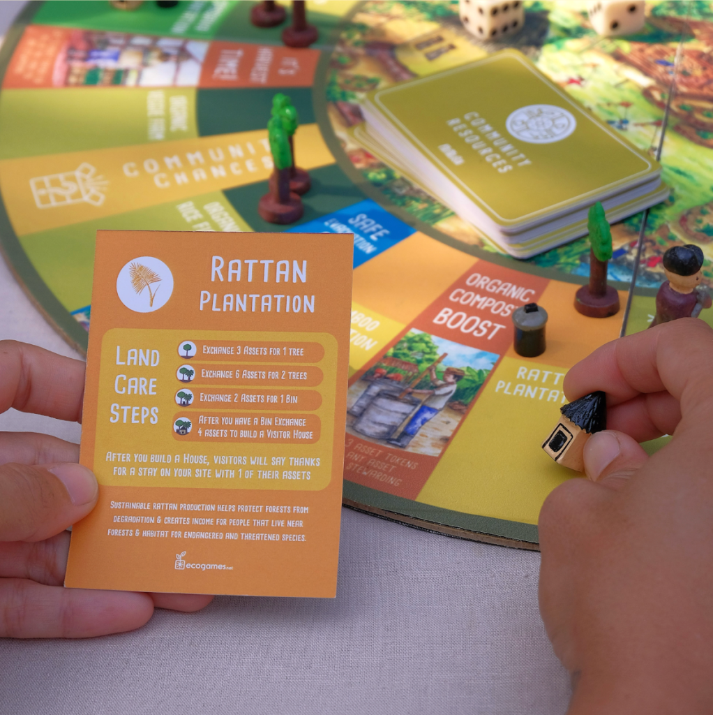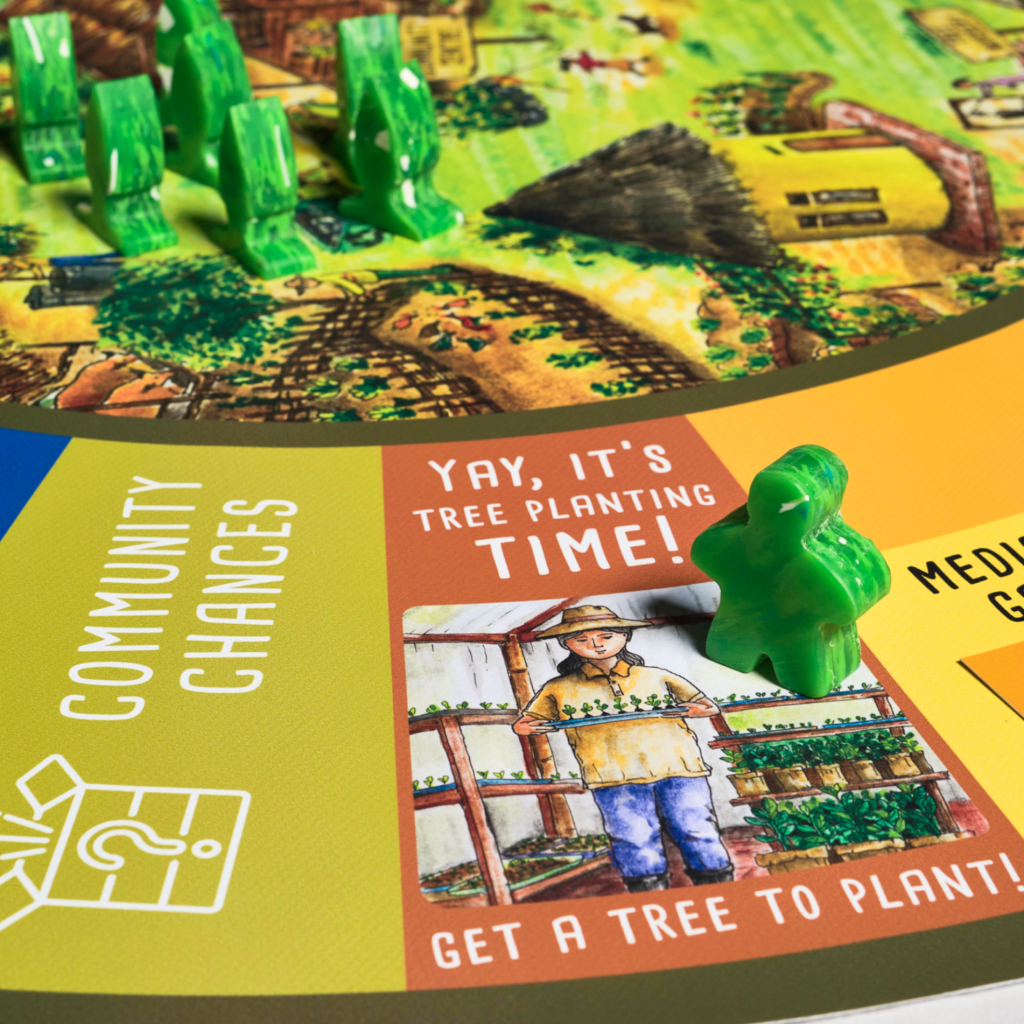 The game comes complete with a game board, community resource cards, chance cards, dice, tokens, trees, and carbon offset certificates. Each component plays a vital role in the game’s immersive and educational gameplay experience.