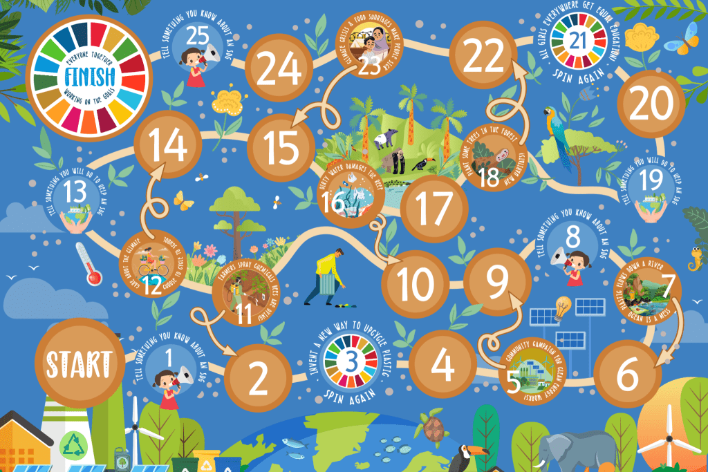 Permainan Papan SDG & Me: Permainan papan ini membawa pemain dalam perjalanan menjelajahi 17 SDG. Dengan menyelesaikan tantangan dan membuat pilihan, para peserta mendapatkan pemahaman yang lebih dalam tentang keterkaitan antara tujuan dan dampak dari keputusan mereka.