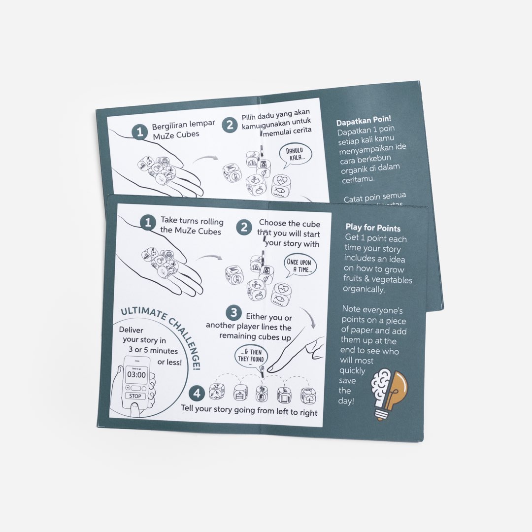 MuZe Cubes memupuk kreativitas dan pemikiran kritis sambil mendorong diskusi tentang keberlanjutan & solusi lingkungan. Bawalah permainan berukuran saku ini ke mana saja untuk memeriahkan suasana dan memulai diskusi yang menarik dengan orang-orang dari segala usia.