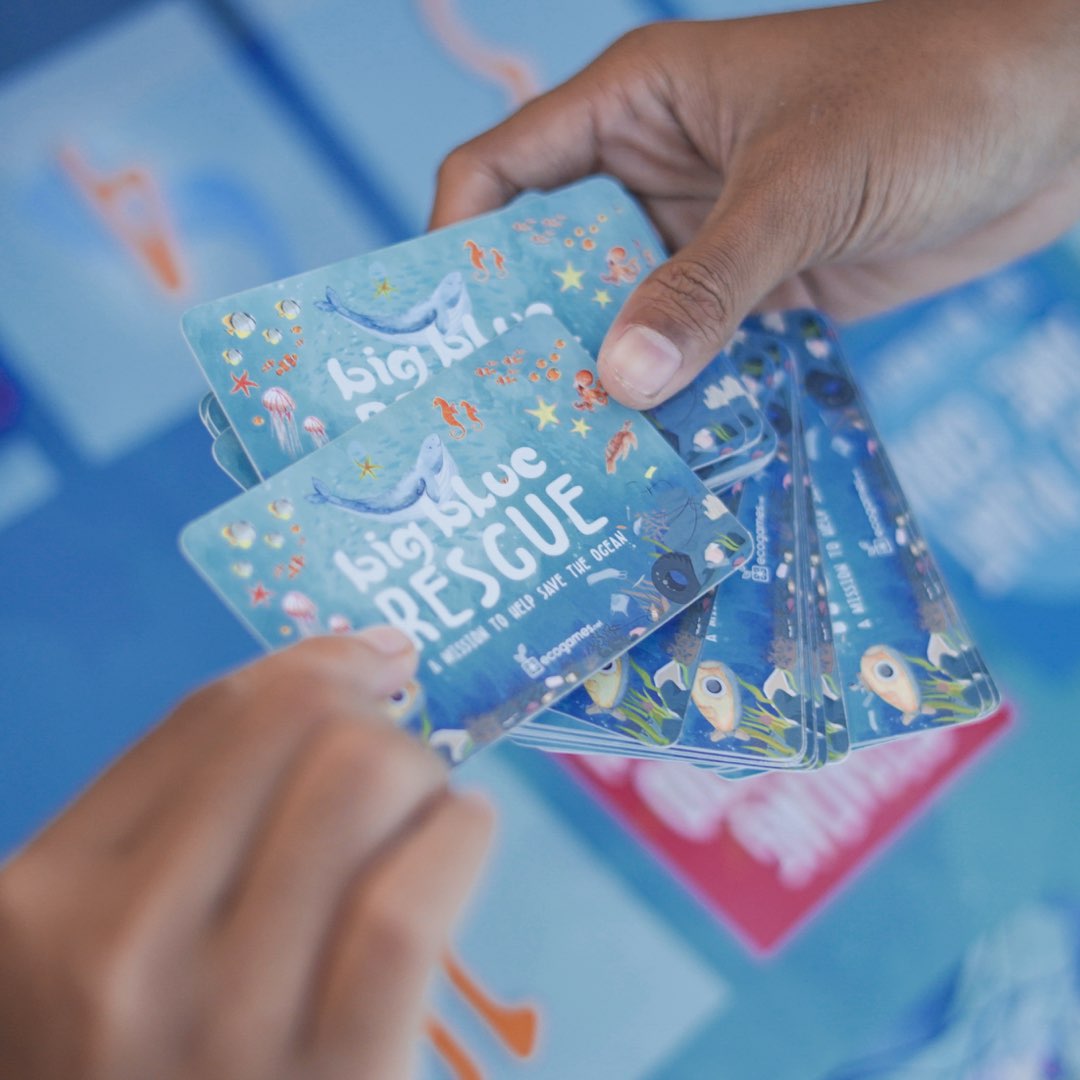 Dive into an aquatic adventure with Big Blue Rescue, the giant game that educates young learners on critical aspects of ocean conservation. This immersive game that can be played in classrooms of up to 30 students, combining strategic challenges with awareness-raising. It introduces players to problems like overfishing and marine pollution, and solutions like no-take zones, and ocean conservation. In Big Blue Rescue, players navigate through various scenarios, making decisions that reflect real-world conservation efforts. Fun fact: The game pieces in Big Blue Rescue are actually handcrafted from upcycled ocean trash!