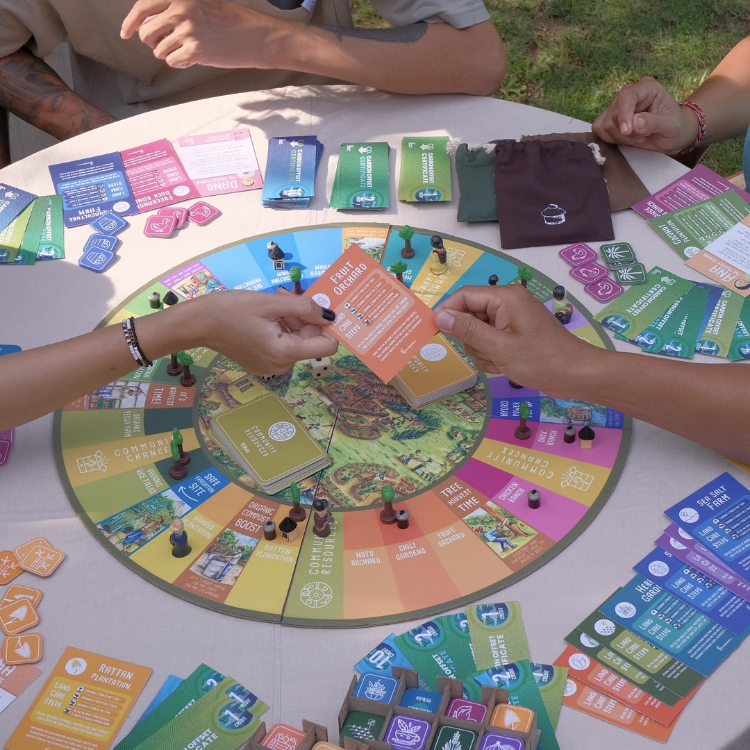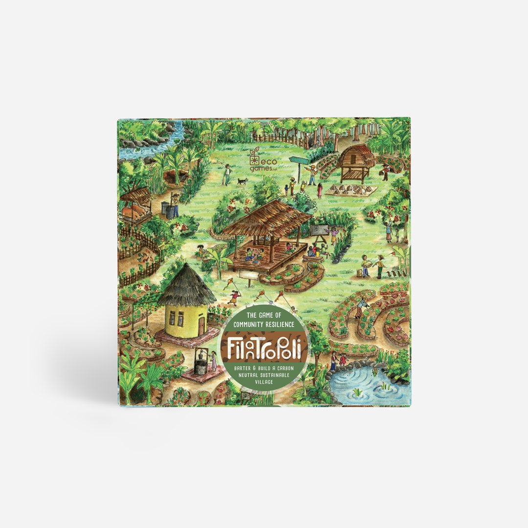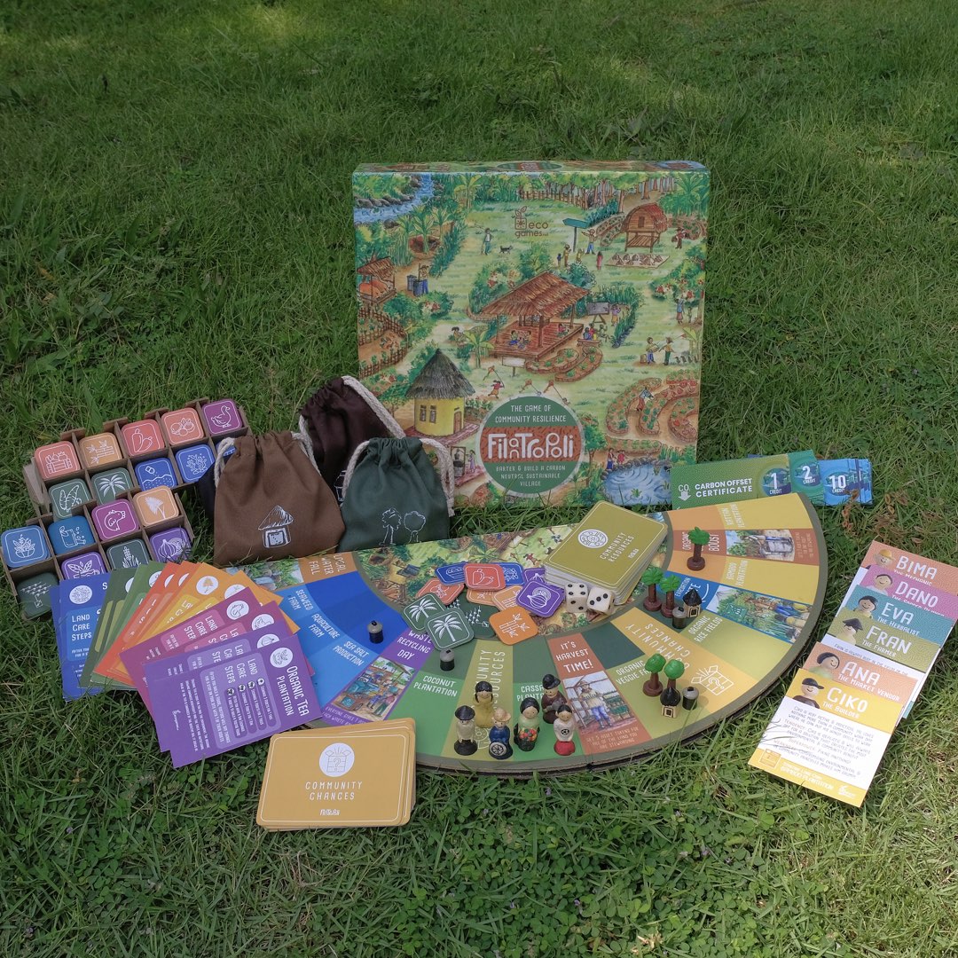 Filantropoli is a cooperative tabletop game where players build a sustainable village, balancing character strengths, managing resources, and responding to disasters. It fosters teamwork, environmental stewardship, and teaches the value of carbon neutrality and resilience, making it perfect for learners and family fun.